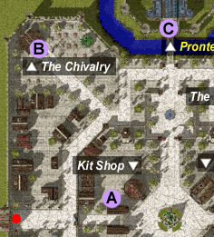 Realizando quest: Ve a Knight's Headquarters (B) al noroeste de Prontera y habla con el NPC. A los 10 minutos ve a hablar con el NPC del castillo de Prontera (C)